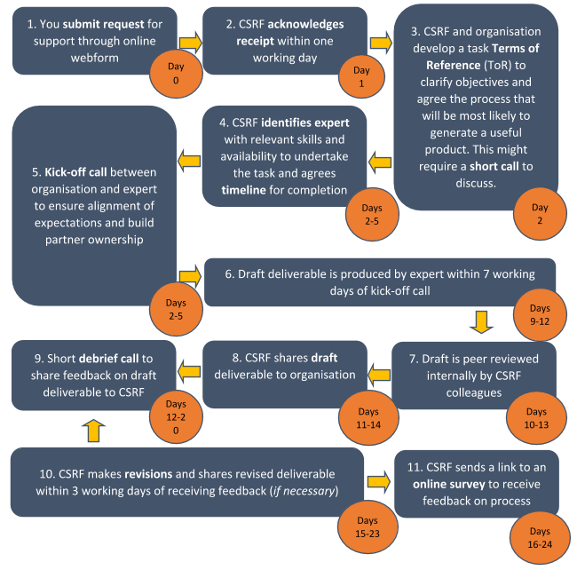 Click here for a flow chart that describes the process for accessing support through the CSRF Helpdesk. We anticipate that this support will be limited and take no more than 5 working days (undertaken over a period of 2 to 3 weeks) to complete. Examples of support that the CSRF could provide include: